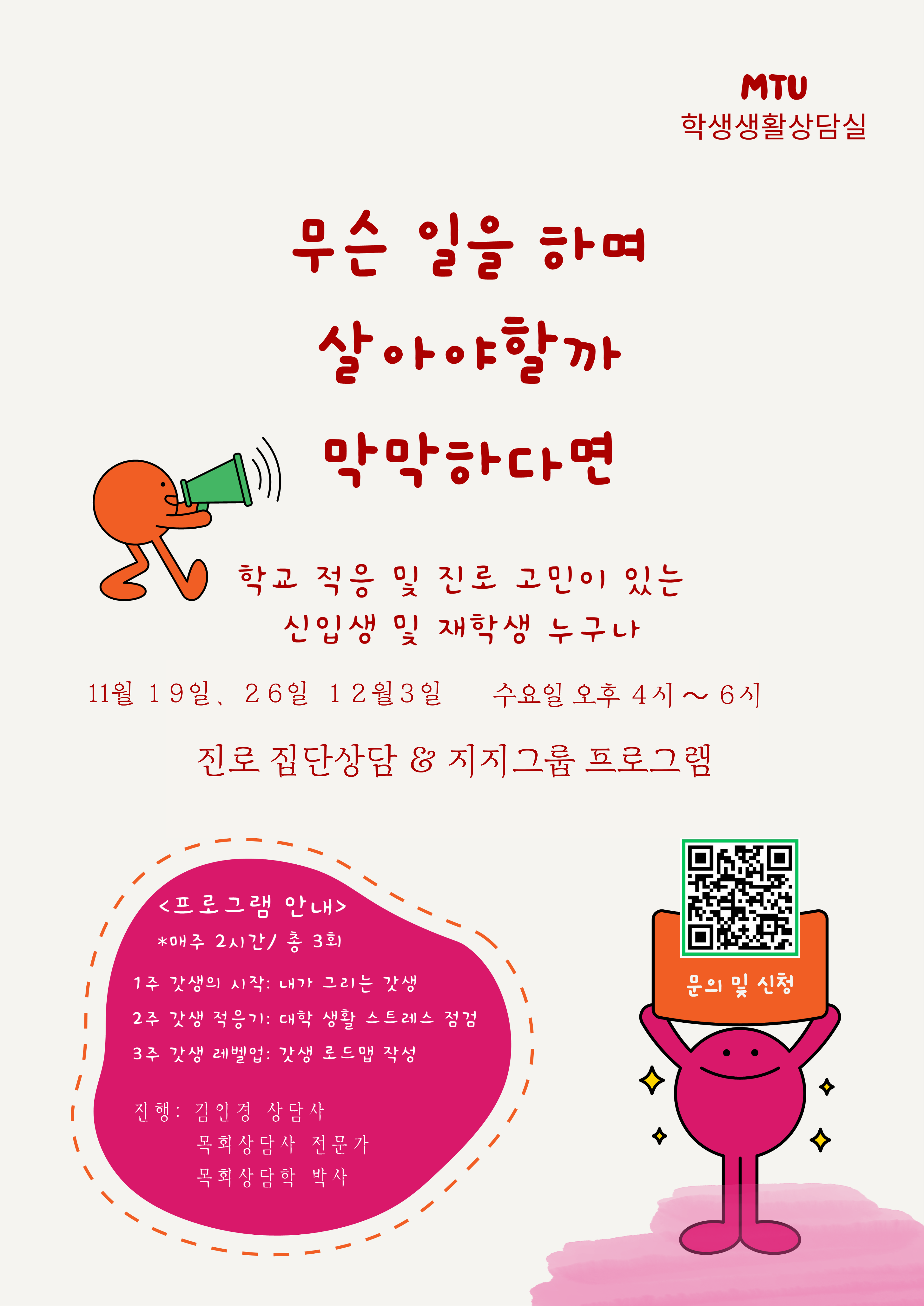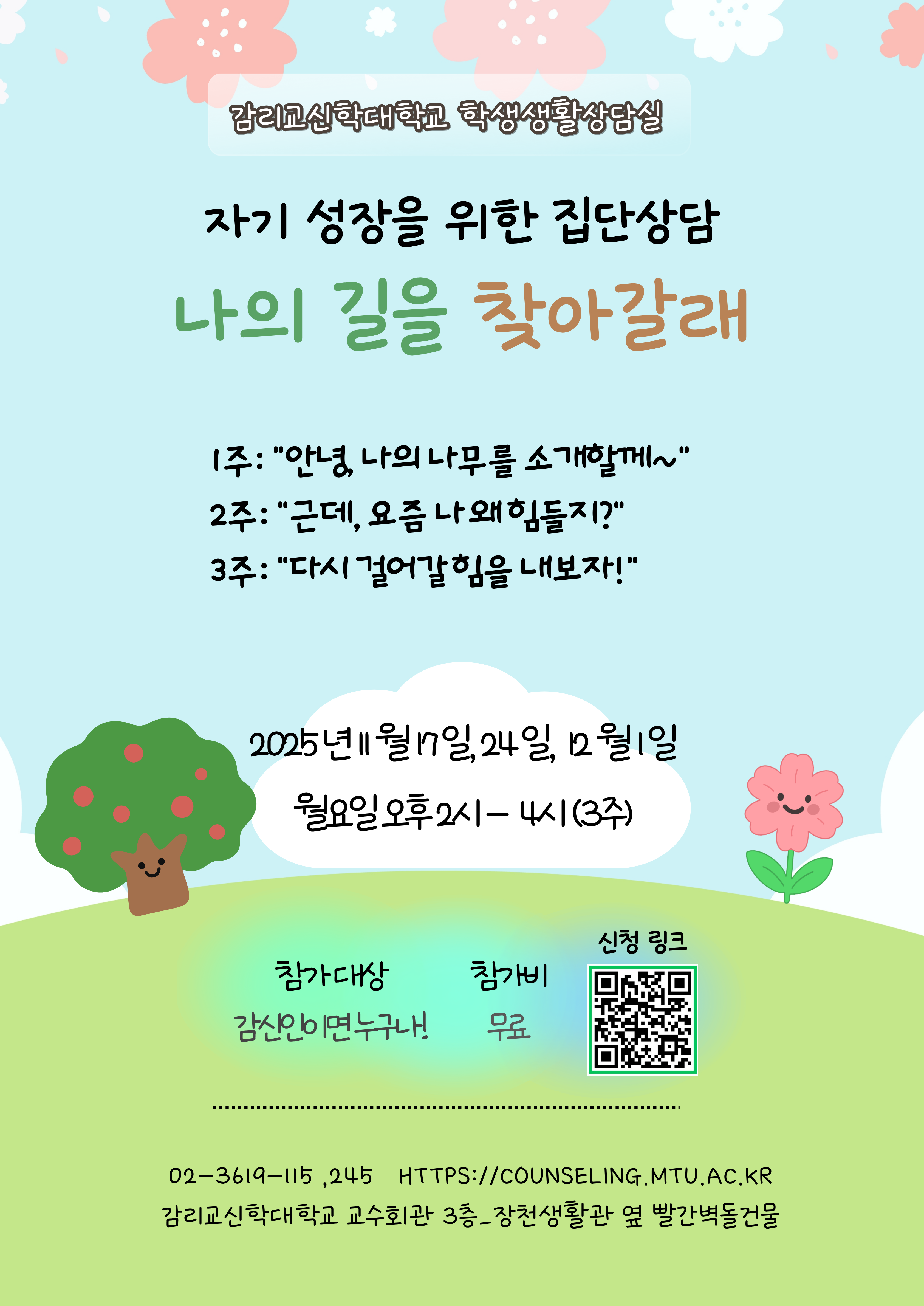 1. 내담자가 5회기 무료 상담 이후, 6회기부터 개인상담을 연장하여 진행할 때 -1회기당 상담비는 10,000원 입니다.2. 수업과제 이외에 개인의 필요 혹은 상담사 협의 하에 필요에 의해 심리검사를 진행할 경우 -MMPI-2는 10,000원 -TCI 는 10,000원 -웩슬러는 30,000원 -기타 심리검사는 상담실에 문의해주세요.<계좌번호>은행명: 신한은행, 예금주: 감리교신학대학교계좌번호: 100-035-770929